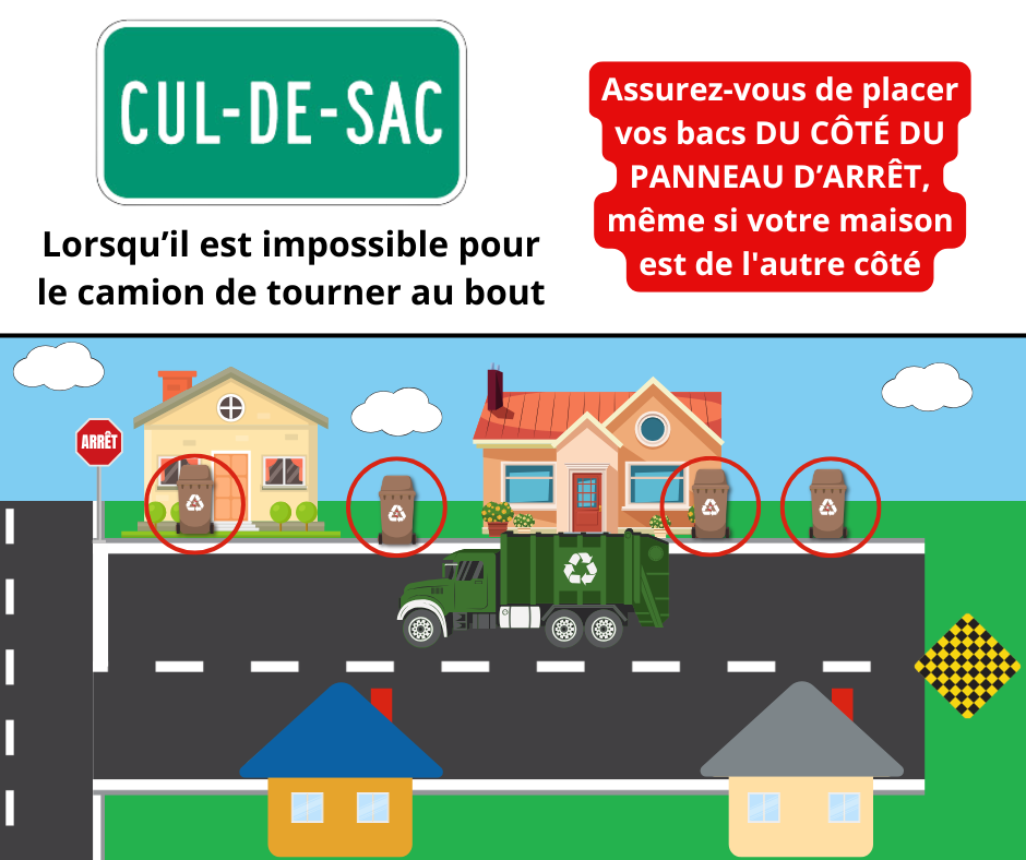 Les résidences des rues en cul-de-sac sans espace de retournement, le camion de collecte circule dorénavant de sorte à pouvoir ressortir de l’avant. Les bacs doivent être mis du côté de la rue permettant au camion de les collecter sur son côté droit, soit le même côté que serait un panneau d'arrêt. Pour connaître les adresses touchées par cette consigne, cliquez ici.