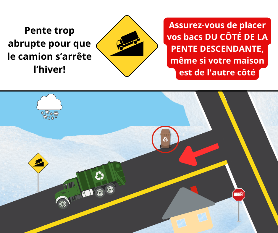 Les résidences des rues à pente abruptes, le camion de collecte circule seulement dans le sens de la pente descendante durant l'hiver (de novembre à avril). Les bacs doivent être mis du côté de la rue descendante permettant au camion de les collecter sur son côté droit. Pour connaître les adresses touchées par cette consigne, cliquez ici.