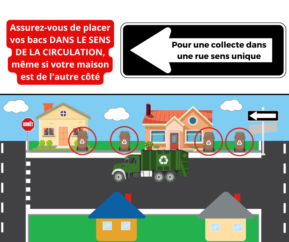 Les résidences des rues à sens unique, le camion de collecte circule seulement dans le sens de la circulation de sorte à respecter le code routier. Les bacs doivent être mis du côté de la rue permettant au camion de les collecter sur son côté droit, soit le même que serait un panneau d'arrêt. Pour connaître les adresses touchées par cette consigne, cliquez ici.