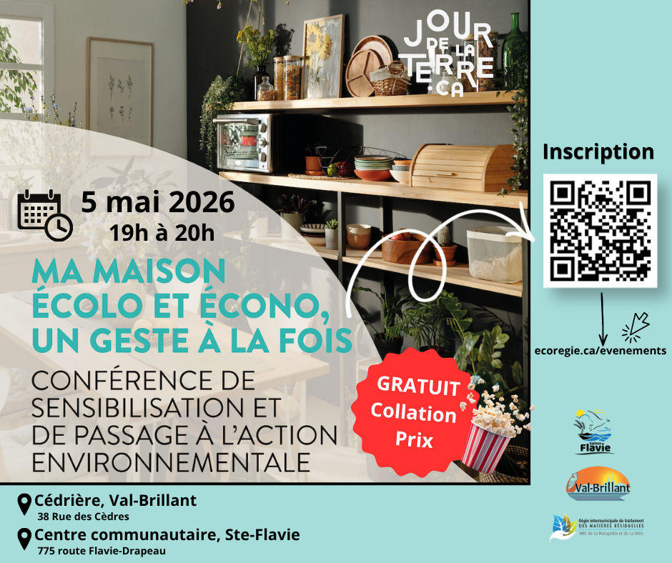La Régie organise une conférence GRATUITE pour tous les citoyens de la Matapédia et de La Mitis en collaboration avec l’organisme du Jour de Terre le 5 mai 2026 de 19h à 20h. Celle-ci sera en mode hybride, c’est-à-dire en virtuel et en présentiel en même temps à la salle municipale de Ste-Flavie (775 rte Flavie-Drapeau) et la Cédrière de Val-Brillant (38 rue des Cèdres). Des collations et des prix seront offerts aux participants en présentiel. Pour plus d’information et pour s’inscrire, consultez-le : www.ecoregie.ca/evenements